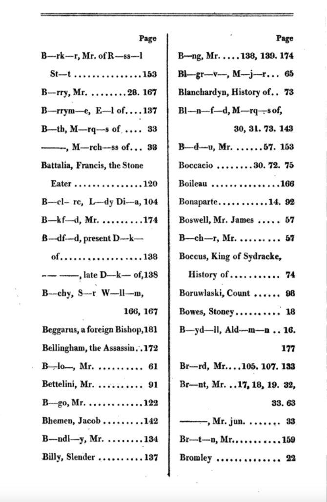 The various wonderful, terrific and eccentric magazines that appeared during this period have never formally been catalogued – to my knowledge at least – though the contemporary Chalcographimania, or, the portrait-collector and printseller’s chronicle contains valuable information (and, inter alia, on of the most hilarious indexes I’ve encountered, full of literal renditions of the bowdlerised references to notables so common in books at this time – check out the sample page to the left). More recently, the crude beginnings of one bibliographic study may be found here, the American end of this publishing phenomenon is discussed in Pitcher and Hartigan’s Sensationalist Literature and Popular Culture in the Early American Republic (2000), and James Gregory wrote on ‘Eccentric biography and the Victorians’ in Biography v30n3 (2007).