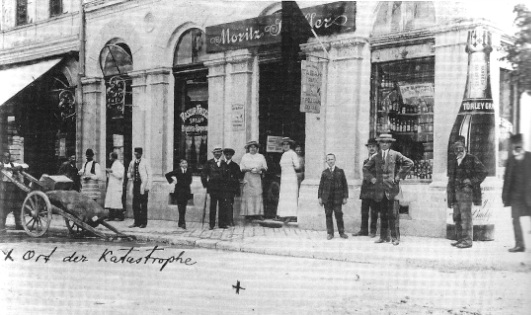 Moritz Schiller’s delicatessen on Franz Joseph Street, Sarajevo, shortly after the assassination of Franz Ferdinand. The “X” marks the spot where Princip stood to fire into the Archduke’s open limo.