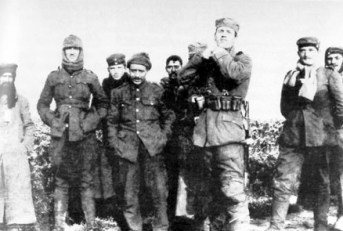 Riflemen Andrew and Grigg (center)—British troops from London—during the Christmas Truce with Saxons of the 104th and 106th Regiments of the Imperial German Army.