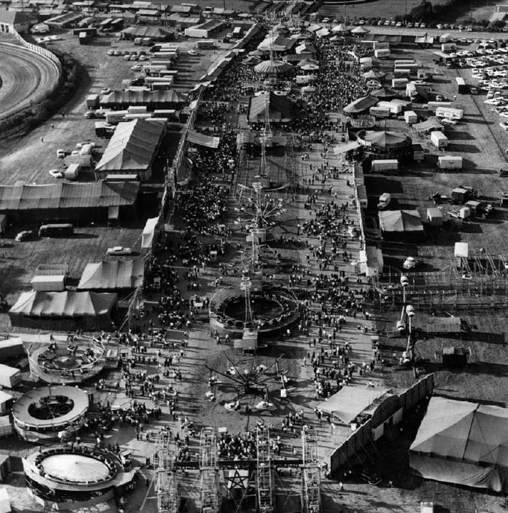 The midway of the Royal American Shows – the largest of any travelling fair in the country – seen, appropriately, from the air during its heyday c. 1950.