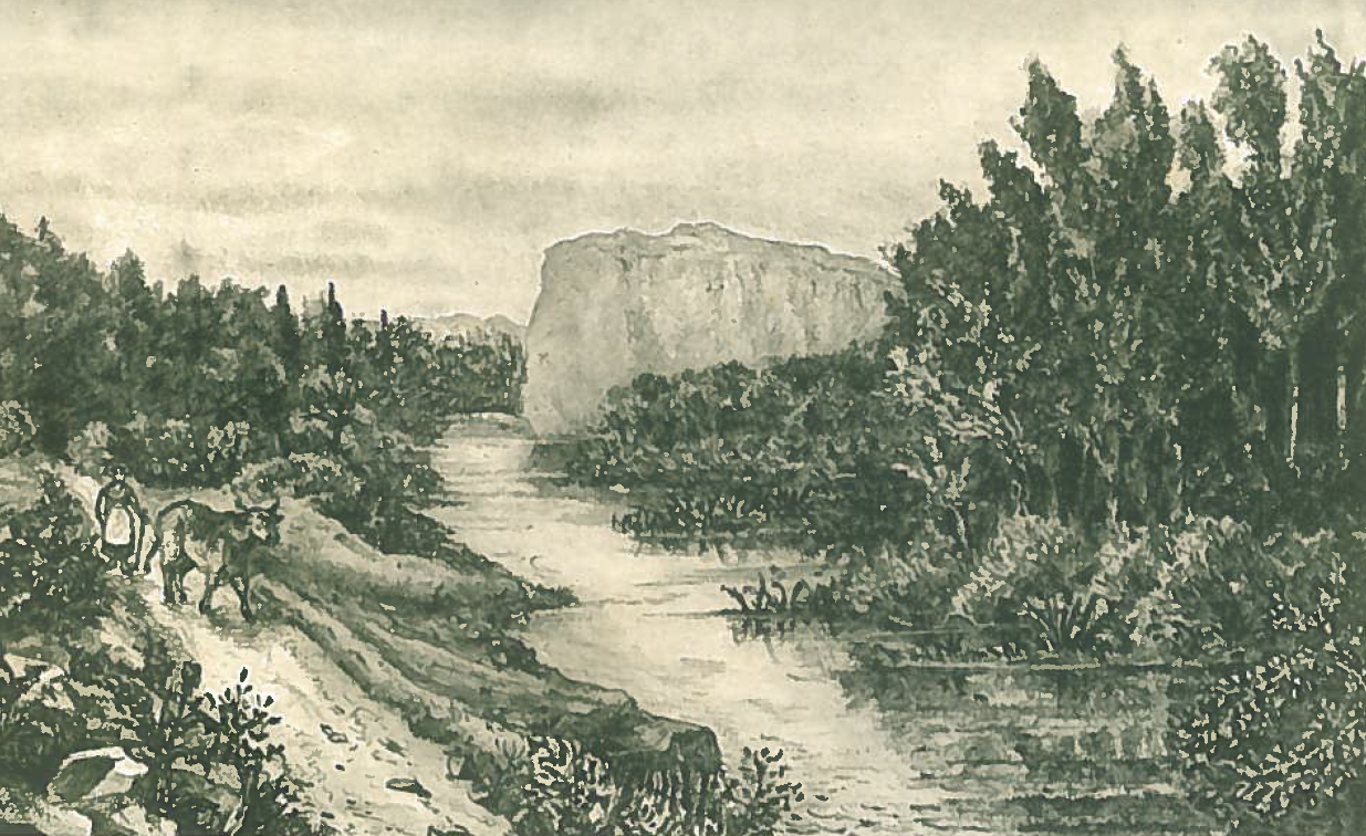 A 19th century sketch of the Blavet at the spot where Conomor’s fortress, Castel Finans, once loomed over the river. Today, thanks to the construction of a dam, the water level is vastly higher, obscuring the great defensive qualities of the position.