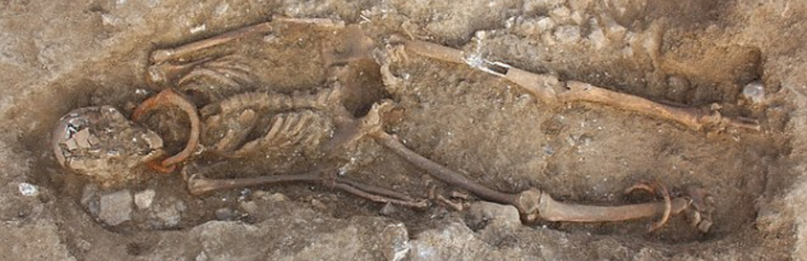 Buried in chains – a Roman-era skeleton, thought to be that of a male slave, excavated near Bordeaux. The body was buried with shackles around the neck, and dates from the 1st century AD.