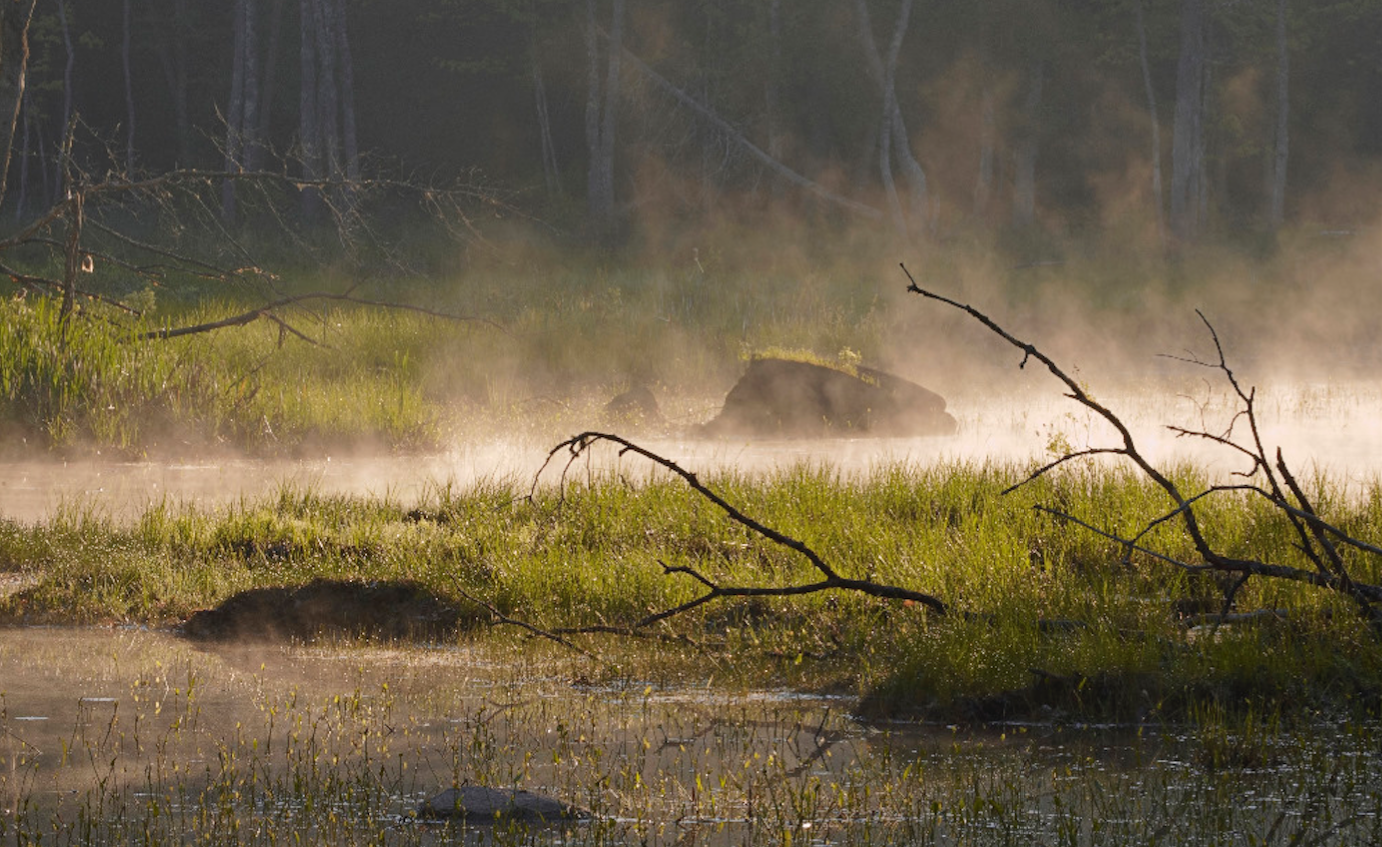 Haunted landscape: morning mist rises over a northern mire.