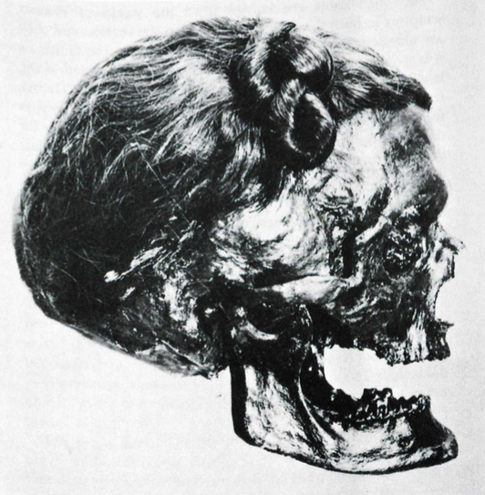 The head of Osterby Man, showing the Suebian Knot tied into his hair – a sign of his high status.