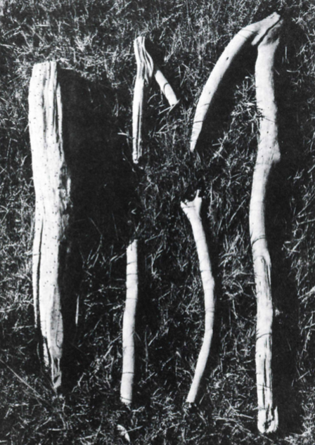 Christens’s account was not written until a year after Gunhild’s body was uncovered; he was not himself present at her disinterral, having his accounts at second hand; and he was prone to flights of fancy – in the same account he speculates that the dead woman was “probably nailed into the mud while still alive… [since] her facial expression immediately after the exhumation could almost clearly be seen as despair.” All this gives us some reason to doubt whether Queen Gunhild really was pinioned to the bottom of a bog in the manner he described. Yet in this case, some of the “pegs” associated with her burial survive [right] – and these do seem to show evidence of the sort of crooks and sharpening that might be expected if they really had been chosen to stake a body in a mire.