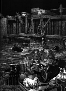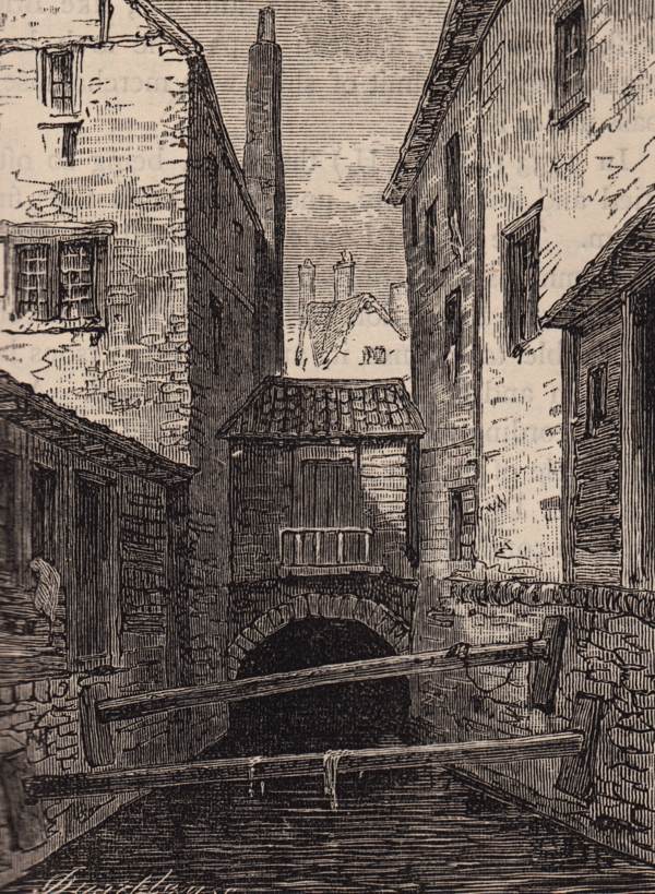 Fleet Ditch – London’s most infamous open sewer – was actually the highly polluted River Fleet. It is seen here in the Victorian period and the river still flows under London today – less polluted now, and completely built over.
