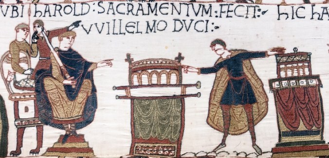 Harold swears his fatal oath of fealty to William – from that masterpiece of Norman-era propaganda, the Bayeux tapestry.