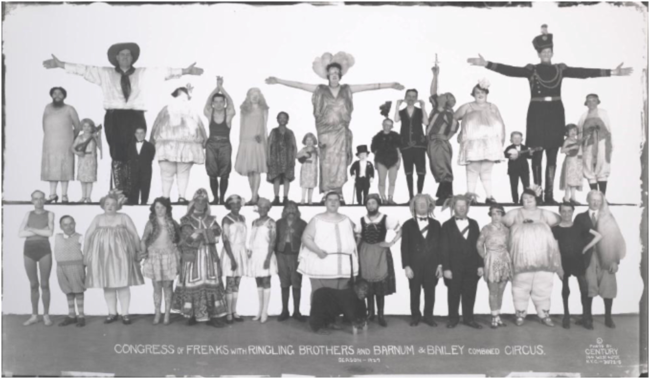 Within his own world, Ho Jo kept some pretty elite company. The Ringling Brothers and Barnum & Bailey Circus was the largest, best-funded and most prestigious of all the travelling shows in the US at this point, with a staff somewhere north of 300 people and its own 60-car railway train, almost a mile long – so perhaps it’s no surprise that Kelty’s 1927 photo also depicts a number of the best-known “freak show” performers of the 1920s, some of them still recognisable today. They include Olga the Bearded Lady (top row, far left), two giants – Jim Tarver (top row, third left) and Jack Earle (top row, second from the right) – Major Mite, billed as the smallest man in the world (top row, just to the right of centre), and Eko and Iko, the two albino Black men with dreads, wearing sashes, on the right hand side of the front row, who were usually billed as “Ambassadors from Mars”. Possibly the most recognisable figure in the image for many people today is Minnie Woolsey, who was billed as Koo-Koo the Bird Girl (top row, wearing a plumed cap and glasses and standing next to Major Mite), though she certainly wasn’t considered an especially major draw at the time this picture was taken. Her modern fame rests on her memorable appearance in the cult 1932 horror movie Freaks, by Dracula director Tod Browning, in which she is seen dancing on the table in the wedding reception sequence.