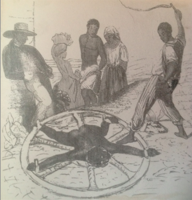 The story of Prince Klaas, the rebel slave, is one of the highlights of the charming Museum of Antigua and Barbuda in St John’s, which I had the chance to wander around in December 2012 while doing some lecturing in the Caribbean. Slave revolts have been an interest of mine for years, and I was familiar with the outlines of Klaas’s remarkable story – which I wrote up for the Smithsonian at the time (causing a certain amount of upset in Antigua itself among people who don’t seem to have actually read the article very closely). But I had never seen a picture that purported to show him, and in fact it’s vanishingly rare for images of slave leaders to survive from so early a period as the first half of the eighteenth century. So when I discovered that the museum displayed a drawing of Klaas, naked, strapped face down to a wheel, and being lashed, I snapped it and later used it as an illustration in the essay that I wrote.